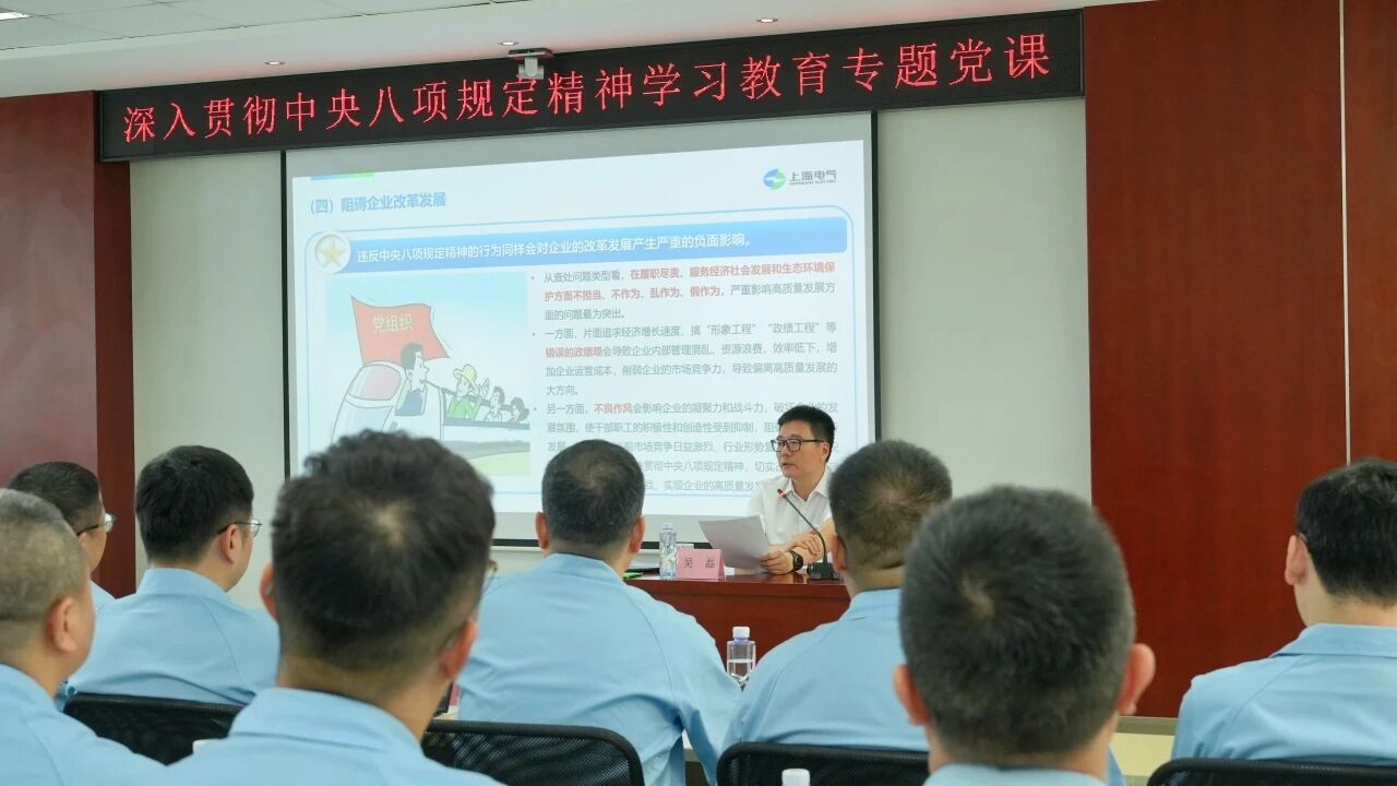 在专题党课中,吴磊强调深入贯彻中央八项规定精神的重要性,尤其要充分认识违反中央八项规定精神的严重危害。他介绍了上海电气集团党委在深入贯彻中央八项规定精神的成效和经验,以及整改整治问题、推动改进作风的实际举措。